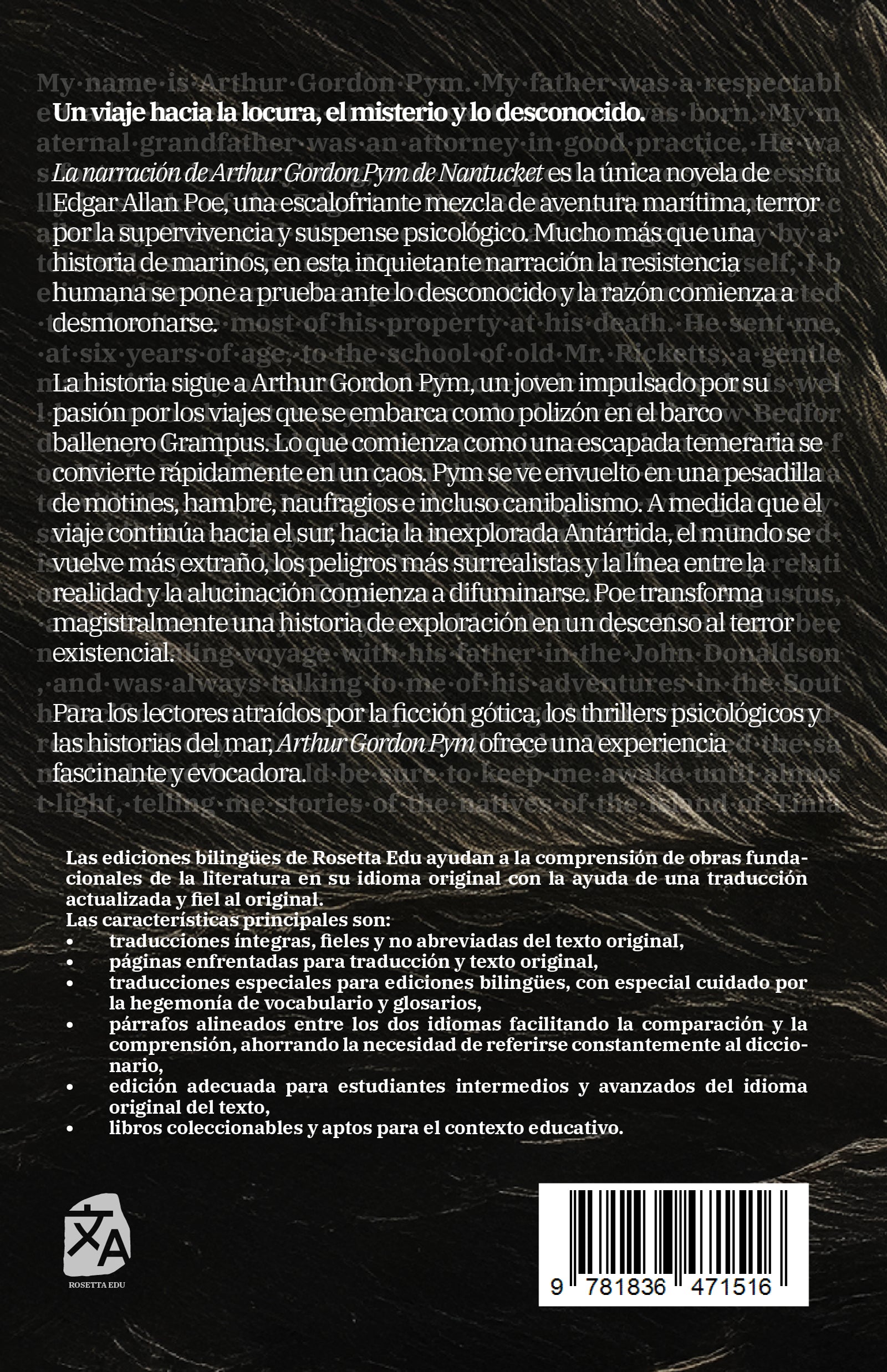 La narración de Arthur Gordon Pym de Nantucket es la única novela de Edgar Allan Poe, una escalofriante mezcla de aventura marítima, terror por la supervivencia y suspense psicológico. Mucho más que una historia de marinos, en esta inquietante narración la resistencia humana se pone a prueba ante lo desconocido y la razón comienza a desmoronarse.